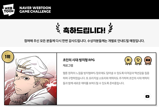 ³×À̹öÀ¥Å÷ÀÌ ÁøÇàÇÑ À¥Å÷ ¿øÀÛ °ÔÀÓ °ø¸ðÀü ¡®³×À̹öÀ¥Å÷ °ÔÀÓ Ã§¸°Áö(NAVER WEBTOON GAME CHALLENGE)¡¯ÀÇ ÃÖÁ¾ ¼ö»óÀÛÀÌ °ø°³µÆ´Ù.