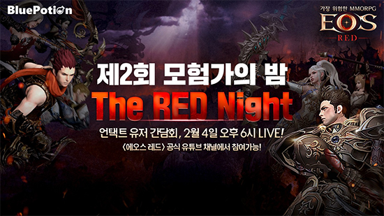 ºí·çÆ÷¼Ç°ÔÀÓÁî°¡ Á÷Á¢ °³¹ßÇÏ°í ¼ºñ½ºÇÏ´Â ¸ð¹ÙÀÏ Á¤Åë MMORPG '¿¡¿À½º ·¹µå'ÀÇ À¯Àú°£´ãȸ ¡®Á¦2ȸ ¸ðÇè°¡ÀÇ ¹ã : The RED Night¡¯°¡ 2¿ù 4ÀÏ 18½Ã¿¡ ¾ðÅÃÆ® ¹æ½ÄÀ¸·Î ÁøÇàµÈ´Ù.