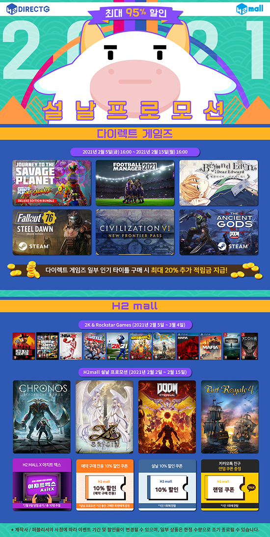 À̿ܿ¡µµ, ·¹µå µ¥µå ¸®µ©¼Ç 2, GTA V ÇÁ¸®¹Ì¾ö ¿¡µð¼Ç, º¸´õ·£µå 3, ¾Æ¿ìÅÍ ¿ùµå, NBA 2K21, ¸¶ÇÇ¾Æ Æ®¸±·ÎÁö µîÀÇ Å¸ÀÌÆ²¿¡ ´ëÇØ¼´Â H2¸ôÀ» ºñ·ÔÇÑ ±¹³» ¼îÇθô ¹× °ÔÀÓ¼¥¿¡¼ 3¿ù 4ÀϱîÁö Ưº° ÇÒÀÎ À̺¥Æ®°¡ ÁøÇàµÇ¸ç, ±× ¹Û¿¡µµ H2¸ô X ¾ÆÁöÆ® ¿¢½º ¼³³¯ À̺¥Æ®, ¿¹¾à ±¸¸Å Àü¿ë 10% ÇÒÀÎ ÄíÆù ¹× ¼³³¯ 10% ÇÒÀÎ ÄíÆù, īī¿ÀÅå Ä£±¸ ·£´ý ÄíÆù ÁõÁ¤ ÇÁ·Î¸ð¼ÇÀÌ µ¿½Ã¿¡ ÁøÇàµÈ´Ù.
