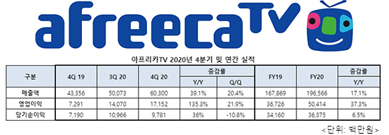 ¾ÆÇÁ¸®Ä«TV´Â ¿¬°á ±âÁØ 2020³â ¿¬°£ ¸ÅÃâ¾×°ú ¿µ¾÷ÀÌÀÍÀÌ °¢°¢ 1,966¾ï ¿ø°ú 504¾ï ¿øÀ» ±â·ÏÇß´Ù°í ¹àÇû´Ù. Àü³â ´ëºñ ¸ÅÃâ¾×Àº 17.1%, ¿µ¾÷ÀÌÀÍÀº 37.3% Áõ°¡Çß´Ù. 2020³â ´ç±â¼øÀÌÀÍÀº 364¾ï ¿øÀ¸·Î Áö³ÇØ ´ëºñ 6.5% »ó½ÂÇß´Ù.