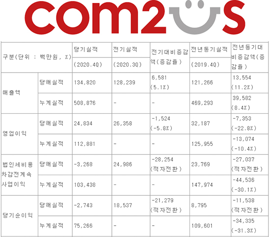 ÄÄÅõ½º´Â 9ÀÏ ½ÇÀû °ø½Ã¸¦ ÅëÇØ 2020³â ¿¬°£ ¸ÅÃâÀÌ Àü³â ´ëºñ 8.4% Áõ°¡ÇÑ 5,089¾ï¿øÀ» ±â·ÏÇß´Ù°í ¹àÇû´Ù. ¿µ¾÷ÀÌÀÍÀº 1,129¾ï¿ø, ´ç±â¼øÀÌÀÍÀº 753¾ï ¿øÀ» ´Þ¼ºÇß´Ù.