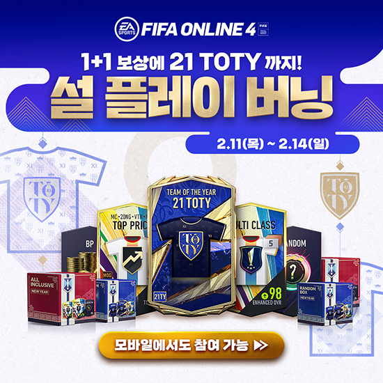 ¡®FIFA ¸ð¹ÙÀÏ¡¯¿¡¼­´Â 11ÀϺÎÅÍ 17ÀϱîÁö °ÔÀÓ¿¡ Á¢¼ÓÇÏ¸é ¡®[º£À̽º] ¼±¼öÆÑ 70+¡¯°ú ¡®½ºÅ¹̳ʡ¯¸¦ ¸ÅÀÏ Á¦°øÇÑ´Ù. 25°ñ µæÁ¡, °ø°Ý¸ðµå Ç÷¹ÀÌ µî Ç÷¹ÀÌ À̺¥Æ® ¹Ì¼ÇÀ» ¿Ï¼öÇÒ ¶§¸¶´Ù ¡®[21TOTY] ·£´ý »óÀÚ ÅäÅ«¡¯, ¡®[Future Star Æ÷ÇÔ] °í±Þ ¼±¼öÆÑ 70+¡¯À» Áö±ÞÇÏ°í ¸ÅÀÏ 60ºÐ ÀÌ»ó °ÔÀÓÀ» Ç÷¹ÀÌÇÏ¸é ¡®[21TOTY] FINAL ÅäÅ«¡¯, ¡®[21TOTY] ·£´ý »óÀÚ ÅäÅ«¡¯, ¡®75,000 TP¡¯¸¦ Á¦°øÇÑ´Ù.