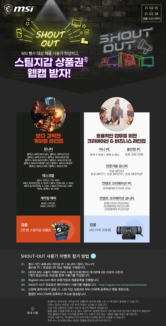 ¿¥¿¡½º¾ÆÀÌÄÚ¸®¾Æ´Â MSI °ÔÀÌ¹Ö PC¿Í ¸ð´ÏÅÍ µî Á¦Ç° ±¸¸Å °í°´ Áß »ç¿ë±â¸¦ ÀÛ¼ºÇÑ °í°´¿¡°Ô 2¸¸ ¿ø ½ºÆÀ Áö°© »óǰ±Ç ¹× MSI FHD ÇÁ·ÎÄ·À» ÁõÁ¤ÇÏ´Â 2021 SHOUT-OUT(ÀÌÇÏ »þ¿ìÆ®-¾Æ¿ô) ÇÁ·Î¸ð¼ÇÀ» 2¿ù 28ÀϱîÁö ÁøÇàÇÑ´Ù.