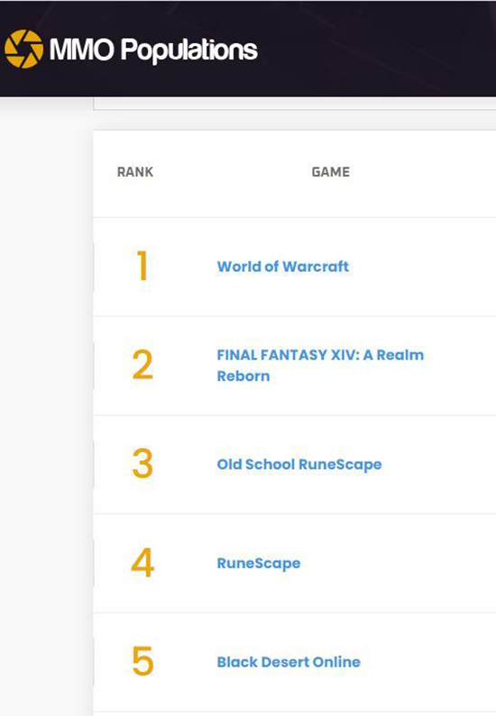 °ÔÀÓ ¼øÀ§ »çÀÌÆ® MMO Populations´Â ÀÚüÀûÀ¸·Î Áý°èÇÑ ´©Àû °¡ÀÔÀÚ¿Í ½ÇÁ¦ Ȱµ¿ ÁßÀÎ ÀÌ¿ëÀÚ ¼ö¸¦ ¸ðµÎ Á¾ÇÕÇØ °ËÀº»ç¸·À» ¡®MOST PLAYED(°¡Àå ¸¹ÀÌ Ç÷¹ÀÌÇÏ´Â) MMORPG¡¯ 5À§·Î ²Å¾Ò´Ù. Çѱ¹ °ÔÀÓ Áß °¡Àå ÁÁÀº ±â·ÏÀ̸ç, ÇØ¿Ü ÀαâÀÛ ¿ùµå ¿Àºê ¿öÅ©·¡ÇÁÆ® Ŭ·¡½Ä(6À§), ¿¤´õ½ºÅ©·Ñ ¿Â¶óÀÎ(8À§) µî º¸´Ù ³ôÀº ¼øÀ§¿¡ À̸§À» ¿Ã·È´Ù.