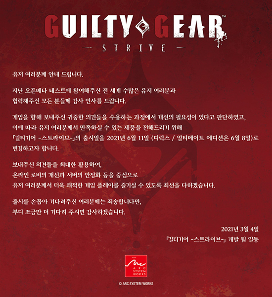 ¾ÆÅ©½Ã½ºÅÛ¿÷½º ¾Æ½Ã¾ÆÁöÁ¡Àº PlayStation¢ç4, PlayStation¢ç5, SteamÀ¸·Î Ãâ½Ã ¿¹Á¤ÀÎ ¡¸±æÆ¼±â¾î¡¹ ½Ã¸®Áî ÃÖ½ÅÀÛ, ¡¸±æÆ¼±â¾î -½ºÆ®¶óÀ̺ê-¡¹(GUILTY GEAR -STRIVE-)ÀÇ Ãâ½ÃÀÏÀ» ¾Æ·¡¿Í °°ÀÌ º¯°æÇÑ´Ù°í ¹àÇû´Ù.