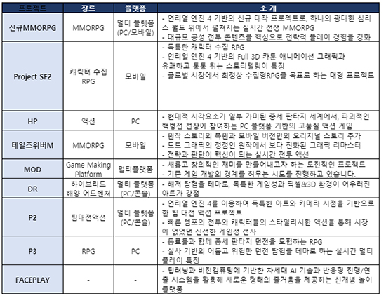 À̹ø ä¿ë¿¡ Âü¿©ÇÏ´Â ½Å±Ô ÇÁ·ÎÁ§Æ®´Â ÃÑ 9Á¾À¸·Î, ¡®½Å±ÔMMORPG¡¯, ¡®Project SF2¡¯, ¡®HP¡¯ µî ³Ø½¼ÀÇ ÇÙ½É °³¹ß ¿ª·®À» ÁýÁßÇÑ ´ëÇü ÇÁ·ÎÁ§Æ®¸¦ ºñ·ÔÇØ, ¸ð¹ÙÀÏ MMORPG ¡®Å×ÀÏÁîÀ§¹ö M¡¯, ÇÏÀ̺긮µå ÇØ¾ç ¾îµåº¥Ã³ À帣ÀÇ ¸ÖƼÇ÷§Æû ŸÀÌÆ² ¡®DR¡¯, ÆÀ ´ëÀü ¾×¼Ç À帣ÀÇ ¡®P2¡¯, RPG À帣ÀÇ PC ¿Â¶óÀΠŸÀÌÆ² ¡®P3¡¯ µî ´Ù¾çÇÑ À帣¿Í Ç÷§ÆûÀ¸·Î ±ÕÇü ÀâÈù ½ÅÀÛµéÀÌ Æ÷ÇԵƴÙ.