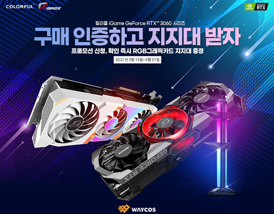 ¿þÀÌÄÚ½º´Â ¡°Ä÷¯Ç® Å×Å©³î·ÎÁö(Colorful Technology Co. LTD)¡±»çÀÇ °ÔÀÌ¹Ö ±×·¡ÇÈÄ«µå ¡®Colorful iGame ÁöÆ÷½º RTX 3060 Advanced/ULTRA OC¡¯ ±¸¸ÅÀÚ¸¦ ´ë»óÀ¸·Î ±¸¸Å ÀÎÁõ ½Ã Ä÷¯Ç® ¡®RGB ±×·¡ÇÈÄ«µå ÁöÁö´ë¡¯¸¦ ÁõÁ¤ÇÏ´Â ÇÁ·Î¸ð¼ÇÀ» ½Ç½ÃÇÑ´Ù.