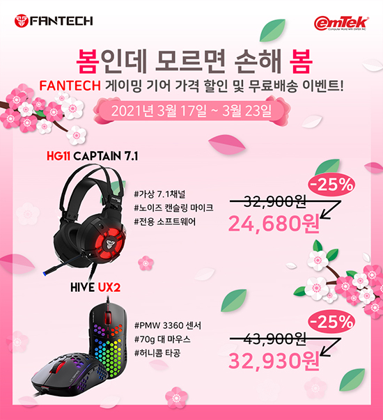 ÀÌ¿¥ÅؾÆÀÌ¿£¾¾´Â °ÔÀÌ¹Ö ±â¾î Àü¹® ºê·£µå FANTECHÀÇ HG11 CAPTAIN 7.1 °ÔÀÌ¹Ö Çìµå¼Â°ú HIVE UX2 °ÔÀÌ¹Ö ¸¶¿ì½º¿¡ ´ëÇÑ ÇÑÁ¤ ¼ö·® Ư°¡¸¦ ÁøÇàÇÑ´Ù. HG11 CAPTAIN 7.1Àº ±âÁ¸ °¡°ÝÀÎ 32,900¿ø¿¡¼ 24,800¿ø¿¡ HIVE UX2´Â 43,900¿ø¿¡¼ 32,930¿øÀ¸·Î ÆÄ°ÝÀûÀÎ 25%ÀÇ ÇÒÀÎ µÈ °¡°Ý¿¡ ¹«·á¹è¼Û±îÁö Áö¿øÇÏ´Â À̹ø Ư°¡ À̺¥Æ®´Â 3¿ù 17ÀϺÎÅÍ 3¿ù 23ÀϱîÁö 11¹ø°¡ »çÀÌÆ® ¼îÅ· µô À̺¥Æ®¸¦ ÅëÇØ ÁøÇàµÈ´Ù.