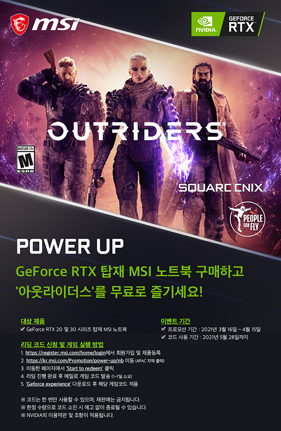 À̺¥Æ®´Â 2021³â 3¿ù 16ÀϺÎÅÍ 4¿ù 15ÀϱîÁö ÇÑÁ¤ ¼ö·®À¸·Î ÁøÇàµÉ ¿¹Á¤À̸ç, ÄÚµå »ç¿ë ±â°£Àº 2021³â 4¿ù 15ÀϱîÁö´Ù. ¸®µõ ÄÚµå ¼ÒÁø ½Ã º» Çà»ç´Â ¿¹°í ¾øÀÌ Á¾·áµÉ ¼ö ÀÖ´Ù. À̺¥Æ® ´ë»ó MSI ³ëÆ®ºÏÀº ¿£ºñµð¾Æ ÁöÆ÷½º RTX 30½Ã¸®Áî(RTX 3080, 3070, 3060) ¹× 20½Ã¸®Áî(RTX 2080 SUPER, 2080, 2070 SUEPR, 2070, 2060) ±×·¡ÇÈ Å¾Àç Á¦Ç°ÀÌ´Ù.