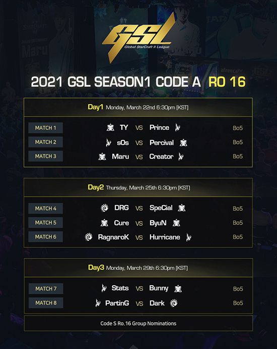 À̹ø ¡®2021 GSL ½ÃÁð1¡¯Àº 3¿ù 22ÀÏ(¿ù)ºÎÅÍ ¾à 7ÁÖ°£ À̾îÁø´Ù. ¸ÕÀú, ÄÚµåS 16°¿¡ ÁøÃâÇÒ 8¸íÀÇ ¼±¼ö¸¦ ¼±¹ßÇÏ´Â ÄÚµåA°¡ 5Àü 3¼±½ÂÁ¦ ½Ì±Û Åä³Ê¸ÕÆ®·Î 3Àϰ£ ÁøÇàµÈ´Ù. ÄÚµåA¿¡¼ ¼±¹ßµÈ 8¸íÀÇ ¼±¼ö´Â ¡®2021 GSL ½´ÆÛÅä³Ê¸ÕÆ® ½ÃÁð1¡¯¿¡¼ ½Ãµå¸¦ ȹµæÇÑ Á¶¼ºÈ£(Trap), ¹ÚÇѼÖ(Zoun), Á¶ÁßÇõ(Dream), ÁÖ¼º¿í(Zest) ±×¸®°í ¿¹¼±ÀüÀ» »óÀ§±ÇÀ¸·Î Åë°úÇÑ À̺´·Ä(Rogue), °¹Î¼ö(Solar), À̽ÅÇü(INnoVation), ¹ÚÁøÇõ(Armani) µî 8¸íÀÇ ¼±¼ö¿Í ÇÕ·ùÇØ ÄÚµåS 16°ÀüÀ» Ä¡¸£°Ô µÉ ¿¹Á¤ÀÌ´Ù.