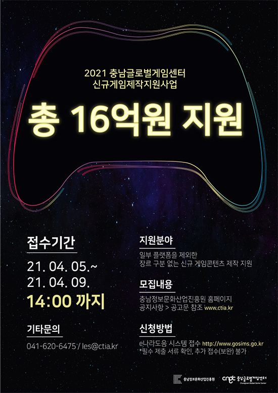 Ãæ³²±Û·Î¹ú°ÔÀÓ¼¾ÅÍ ¿ÃÇØ ù Áö¿ø»ç¾÷ÀÎ ¡®½Å±Ô°ÔÀÓ Á¦ÀÛÁö¿ø¡¯Àº °ÔÀÓÀÇ À帣¿Í ¼ºñ½º Ç÷§Æû¿¡ °ü°è¾øÀÌ ÀÚÀ¯·Ó°Ô ½Åû °¡´ÉÇϸç, ½ÅûÀÛ Áß ±Û·Î¹ú Æ®·£µå¿¡ °É¸Â´Â ǰÁú ³ôÀº °ÔÀÓ ÄÜÅÙÃ÷¸¦ ¼±º°ÇÏ¿© Á¦ÀÛ Áö¿øÇÏ´Â ÇÁ·Î±×·¥ÀÌ´Ù.