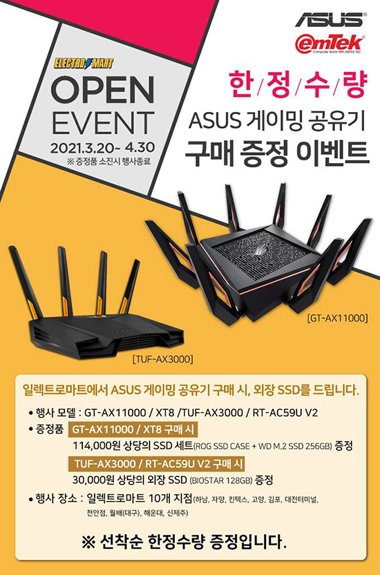 À̹ø ÀÏ·ºÆ®·Î¸¶Æ® 10°³ ÁöÁ¡(Çϳ², ÀÚ¾ç, ŲŨ½º, °í¾ç, ±èÆ÷, ´ëÀüÅ͹̳Î, õ¾ÈÁ¡, ¿ù¹è(´ë±¸), ÇØ¿î´ë, ½ÅÁ¦ÁÖ) ¿ÀÇÂÀ» ±â³äÇÏ¿© ASUS °øÀ¯±â¸¦ ã¾ÆÁֽô ¿ÀÇÁ¶óÀÎ °í°´À» ´ë»óÀ¸·Î 3¿ù 20ÀϺÎÅÍ 4¿ù 30ÀϱîÁö Çà»ç ¸ðµ¨ ±¸¸Å ½Ã, 11¸¸¿ø »ó´çÀÇ SSD ¼¼Æ® ÁõÁ¤ Çà»ç¸¦ ÁøÇàÇÑ´Ù.