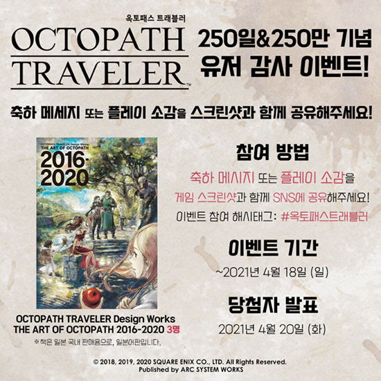 ¾ÆÅ©½Ã½ºÅÛ¿÷½º ¾Æ½Ã¾ÆÁöÁ¡Àº SQUARE ENIX CO., LTD.ÀÇ RPG, ¡¸¿ÁÅäÆÐ½º Æ®·¡ºí·¯¡¹ Nintendo Switch¢â Çѱ¹¾î ÆÐŰÁöÆÇÀÇ Ãâ½Ã 250Àϰú ¡¸¿ÁÅäÆÐ½º Æ®·¡ºí·¯¡¹ÀÇ ±Û·Î¹ú ÃâÇÏ ¹× ´Ù¿î·Îµå ÆÇ¸Å·® ´©°è 250¸¸Àå µ¹ÆÄ¸¦ ±â³äÇÏ¿©, ¡®OCTOPATH TRAVELER Design Works THE ART OF OCTOPATH 2016-2020¡¯¡ØÀ» Ãß÷À» ÅëÇØ ÁõÁ¤ÇÏ´Â À¯Àú °¨»ç À̺¥Æ®¸¦ ¿À´Ã(3¿ù 30ÀÏ)ºÎÅÍ °³ÃÖÇÑ´Ù°í ¹ßÇ¥Çß´Ù.