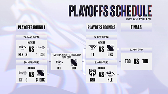 Áö³ Ç÷¹ÀÌ¿ÀÇÁ 1¶ó¿îµå¿¡¼´Â ÇÑÈ»ý¸íe½ºÆ÷Ã÷°¡ ¸®ºê »÷µå¹Ú½º¿¡ 3:1·Î, DRX°¡ kt ·Ñ½ºÅ͸¦ »ó´ë·Î 3:0À¸·Î ¿Ï½ÂÀ» °Åµ×´Ù. Á¤±Ô ½ÃÁð 1À§·Î 2¶ó¿îµå¿¡ ¼±ÂøÇÑ T1Àº DRX¸¦ »ó´ë·Î Áö¸íÇØ, T1 ´ë DRX, Á¨Áö e½ºÆ÷Ã÷ ´ë ÇÑÈ»ý¸íe½ºÆ÷Ã÷ÀÇ ´ëÁøÀÌ ¿Ï¼ºµÆ´Ù.