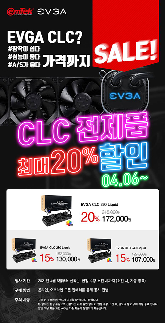 ÀÌ¿¥ÅؾÆÀÌ¿£¾¾(ÀÌ¿¥ÅØ)´Â 2021³â 4¿ù 6ÀϺÎÅÍ ¿Â, ¿ÀÇÁ¶óÀÎ ¸ðµç ÆÇ¸Åó¸¦ ÅëÇØ À¯Åë, ÆÇ¸Å ÁßÀÎ, EVGA CLC 360, 280, 240 Liquid ÀÏüÇü ¼ö³Ã Äð·¯ Á¦Ç°À» ÃÖ´ë 20%¿¡¼ 15%±îÁö ÇÒÀÎµÈ °¡°Ý¿¡ ¼±Âø¼ø, ÇÑÁ¤ ¼ö·® ÆÇ¸Å¸¦ ÁøÇàÇÑ´Ù°í ¹àÇû´Ù.