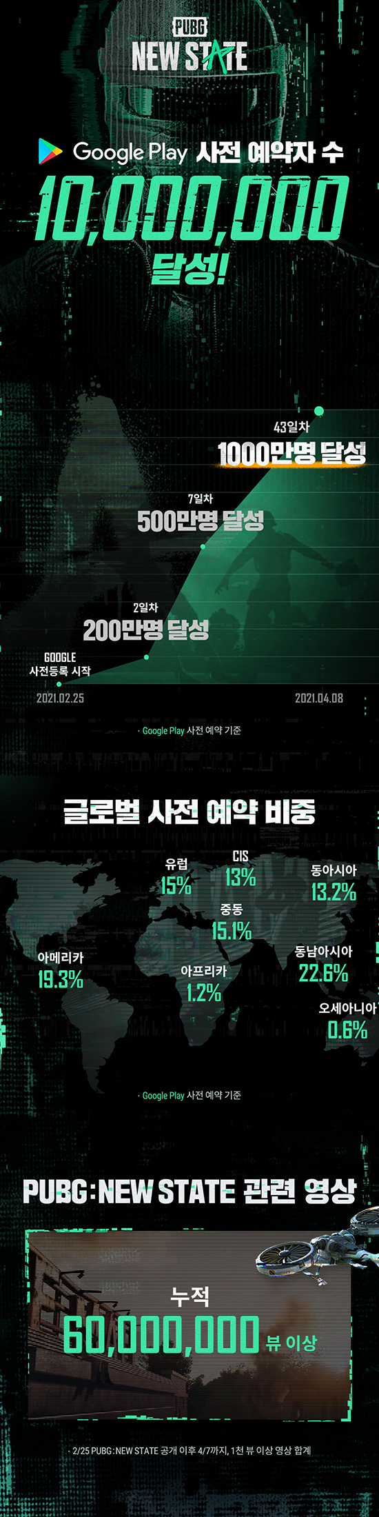 »çÀü¿¹¾à¿¡´Â Àü ¼¼°è 170¿© °³±¹¿¡¼ Âü¿©Çß´Ù. ±Ç¿ªº°·Î »ìÆìº¸¸é µ¿³²¾Æ½Ã¾Æ(22.6%)ÀÇ ºñÁßÀÌ °¡Àå ³ô¾ÒÀ¸¸ç, ´ÙÀ½Àº ¾Æ¸Þ¸®Ä«(19.3%), Áßµ¿(15.1%), À¯·´(15%), µ¿¾Æ½Ã¾Æ(13.2%) ¼øÀ¸·Î ³ªÅ¸³µ´Ù. ÀÌ·Î½á ¡®Ç÷¹À̾î¾ð³ë¿î½º ¹èƲ±×¶ó¿îµå(PUBG, ÀÌÇÏ ¹èƲ±×¶ó¿îµå)¡¯ IPÀÇ Áö¿ª ÆíÁß ¾ø´Â ¼¼°èÀûÀÎ Àαâ¿Í ¿µÇâ·ÂÀ» ´Ù½Ã Çѹø ÀÔÁõÇÑ µ¿½Ã, ¹èƲ±×¶ó¿îµå: NEW STATEÀÇ ±Û·Î¹ú ÈïÇàÀ» ¿¹°íÇß´Ù.