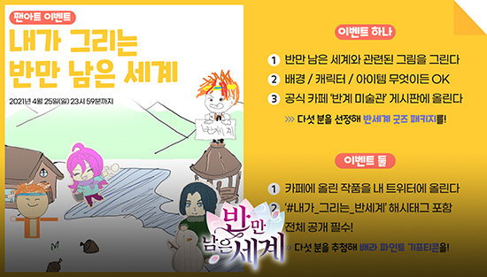 À̹ø À̺¥Æ®´Â ÇöÀç »çÀü¿¹¾à ÁßÀÎ ¡®¹Ý¸¸ ³²Àº ¼¼°è¡¯ÀÇ ÆÒµé¿¡°Ô Àç¹ÌÀÖ´Â Ãß¾ïÀ» ¼±»çÇϰíÀÚ ±âȹµÇ¾ú´Ù. À¯Àú°¡ '¹Ý¸¸ ³²Àº ¼¼°è¡¯¿Í °ü·ÃÇÏ¿© ÀÚÀ¯·Ó°Ô ±×¸° ÆÒ¾ÆÆ®¸¦ Á¦ÃâÇÏ´Â ¹æ½ÄÀ¸·Î, Âü°¡ Èñ¸ÁÀÚ´Â 4¿ù 16ÀϺÎÅÍ 25ÀϱîÁö ÃÑ 10ÀÏ °£ °ø½Ä Ä«Æä ³» ¡®¹Ý°è ¹Ì¼ú°ü¡¯ °Ô½ÃÆÇ¿¡ ±×¸²À» ¾÷·ÎµåÇÒ ¼ö ÀÖ´Ù. À̺¥Æ® Á¾·á ÈÄ¿¡´Â ´Ù¼¸ ¸íÀ» ¼±Á¤ÇÏ¿© ¡®¹Ý¸¸ ³²Àº ¼¼°è¡¯ÀÇ ±ÂÁ Áö±ÞÇÒ ¿¹Á¤À̸ç, ¼±Á¤µÈ ÆÒ¾ÆÆ®´Â ÃßÈÄ °ÔÀÓ ¼Ó¿¡¼µµ ¸¸³ªº¼ ¼ö ÀÖ´Ù.