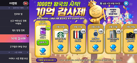 Áö³ 6ÀÏ Ãâ½Ã µÎ ´Þ ¹Ý ¸¸¿¡ ±Û·Î¹ú ´©Àû 1000¸¸ ´Ù¿î·Îµå¸¦ ´Þ¼ºÇÑ ÄíŰ·±: Å·´ýÀº À¯ÀúµéÀÇ »ç¶û°ú ¼º¿ø¿¡ º¸´äÇϰíÀÚ, 4¿ù 23ÀϺÎÅÍ 5¿ù 13ÀϱîÁö ÃÑ 10¾ï¿ø »ó´çÀÇ °æÇ°À» Á¦°øÇÏ´Â °¨»çÁ¦¸¦ ÁøÇàÇÑ´Ù. ¡ãű×È£ÀÌ¾î ½Ã°è ¡ã¾ÆÀÌÆù12 ¡ãºñ½ºÆ÷Å© ³ÃÀå°í ¡ãQLED TV ¡ã½ºÅ¸ÀÏ·¯ ¡ãÁ¦³×¹Ù ½ºÇÇÄ¿ ¡ã»ý·Î¶û ¹é ¡ã½ºÅ¸¹÷½º »óǰ±Ç ¡ãÄíŰ·±: Å·´ý °ÔÀÓ ¾ÆÀÌÅÛ µî ´Ù¾çÇÑ °æÇ°ÀÌ Ç³¼ºÇÏ°Ô ¸¶·ÃµÇ¾î ÀÖ´Ù.
