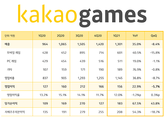 [īī¿À°ÔÀÓÁî] 2021³â 1ºÐ±â ¸ÅÃâ Àü³â µ¿±â ´ëºñ 35% Áõ°¡ 1,301¾ï ¿ø ´Þ¼º |