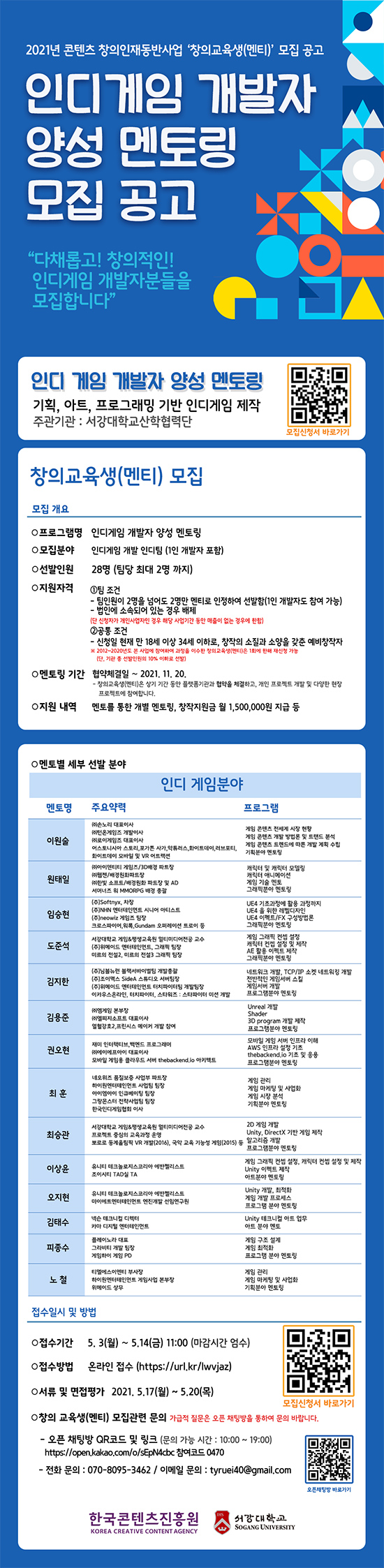 Çѱ¹ÄÜÅÙÃ÷ÁøÈï¿ø°ú ¼°´ëÇб³ »êÇÐÇù·Â´ÜÀº °ÔÀÓ ÄÜÅÙÃ÷ Á¦ÀÛÀÚ À°¼ºÀ» À§ÇÑ '2021³âµµ ÄÜÅÙÃ÷ âÀÇÀÎÀç µ¿¹Ý»ç¾÷'À» ÁøÇàÇϸç, ¿À´Â 5¿ù 14ÀϱîÁö âÀÇ ±³À°»ý(¸àƼ)À» ¸ðÁýÇÑ´Ù°í 3ÀÏ ¹àÇû´Ù.