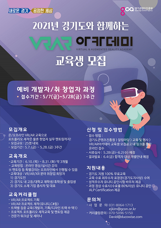 °æ±âµµ´Â °¡»ó/Áõ°Çö½ÇÀ» Æ÷ÇÔÇÑ È®ÀåÇö½Ç ½Ç°¨±â¼ú(VR/AR/XR) Àü¹®Àη ¾ç¼ºÀ» À§ÇÑ ¡®2021³â VR/AR ¾ÆÄ«µ¥¹Ì¡¯¸¦ °³°Çϰí, Ã롤â¾÷°úÁ¤ ±³À°»ýÀ» ¿À´Â 28ÀϱîÁö ¸ðÁýÇÑ´Ù°í 11ÀÏ ¹àÇû´Ù.