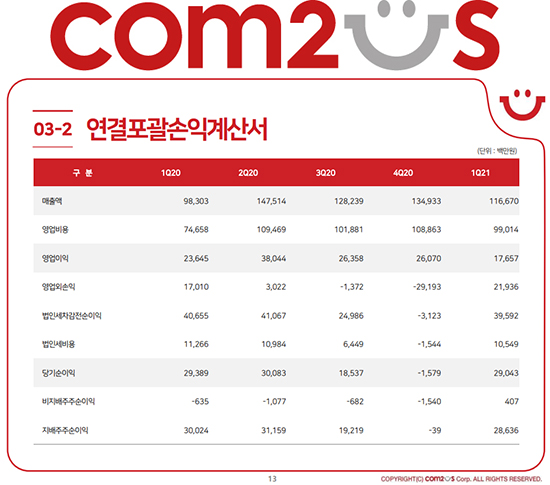 ÄÄÅõ½º´Â 2021³â 1ºÐ±â ¸ÅÃâ 1,167¾ï ¿ø, ¿µ¾÷ÀÌÀÍ 177¾ï ¿ø, ´ç±â¼øÀÌÀÍ 290¾ï ¿øÀ» ±â·ÏÇß´Ù°í 12ÀÏ °ø½ÃÇß´Ù.
