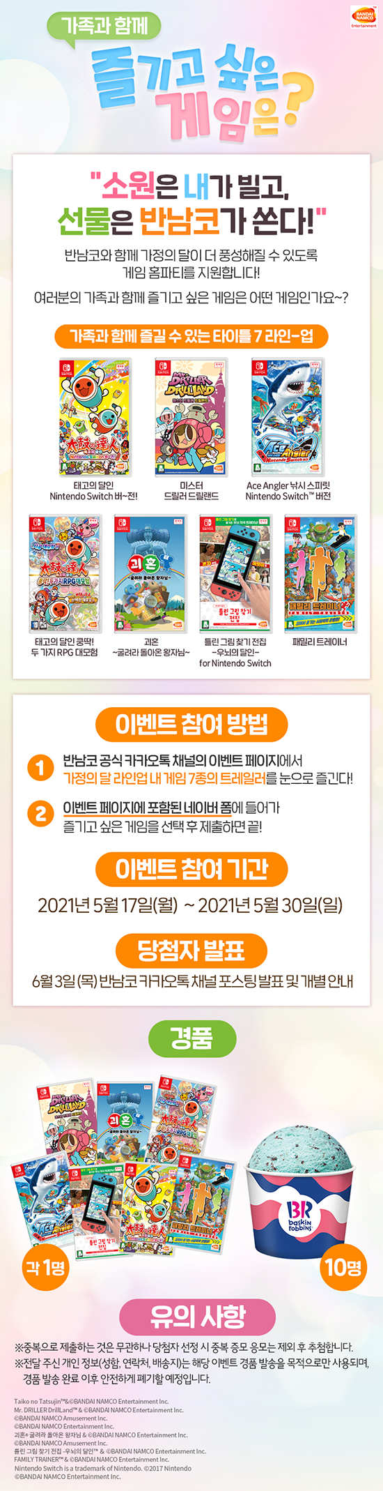 ¹Ý´ÙÀ̳²ÄÚ ¿£ÅÍÅ×ÀÎ¸ÕÆ® ÄÚ¸®¾Æ¿¡¼ ¹ß¸ÅÇÑ Nintendo Switch¢â¿ë Àα⠰ÔÀÓ Å¸ÀÌÆ² 7Á¾ °¡¿îµ¥ Ç÷¹ÀÌÇÏ°í ½ÍÀº ŸÀÌÆ²À» °í¸£°í, ¼±ÅÃÇÑ ÀÌÀ¯ µîÀ» À̺¥Æ® Âü¿© Æû¿¡ ³²±â¸é, Ãß÷À» ÅëÇØ ÀÚ½ÅÀÌ ¼±ÅÃÇÑ °ÔÀÓ Å¸ÀÌÆ²(¼ÒÇÁÆ® ´ç 1¸í, ÃÑ 7¸í), ¹è½ºÅ²¶óºó½º ÆÐ¹Ð¸® ¾ÆÀ̽ºÅ©¸² ±³È¯±Ç(10¸í)À» ÁõÁ¤ÇÑ´Ù.