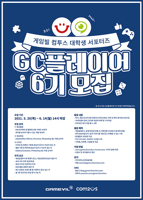 °ÔÀÓºô°ú ÄÄÅõ½º°¡ ÇÔ²² ÁøÇàÇÏ´Â ¡®GCÇ÷¹À̾´Â ¾ç»ç¿¡ ´ëÇÑ ³ôÀº °ü½É°ú °ÔÀÓ »ê¾÷ °ü·Ã ¿Á¤À» Áö´Ñ ´ëÇлý(ÈÞÇлý °¡´É)À̶ó¸é ´©±¸µçÁö Áö¿øÇÒ ¼ö ÀÖ´Ù. À̹ø GCÇ÷¹À̾î 6±â´Â ³»´Þ 14ÀϱîÁö °ø½Ä ä¿ë ȨÆäÀÌÁö(http://www.gamevilcom2us-recruit.com)¸¦ ÅëÇØ Áö¿øÇÒ ¼ö ÀÖÀ¸¸ç, Áö¿ø °ü·Ã ±Ã±ÝÇÑ »çÇ×Àº À̸ÞÀÏÀ̳ª īī¿ÀÅåÀ» ÅëÇØ ¹®ÀÇÇÒ ¼ö ÀÖ´Ù.