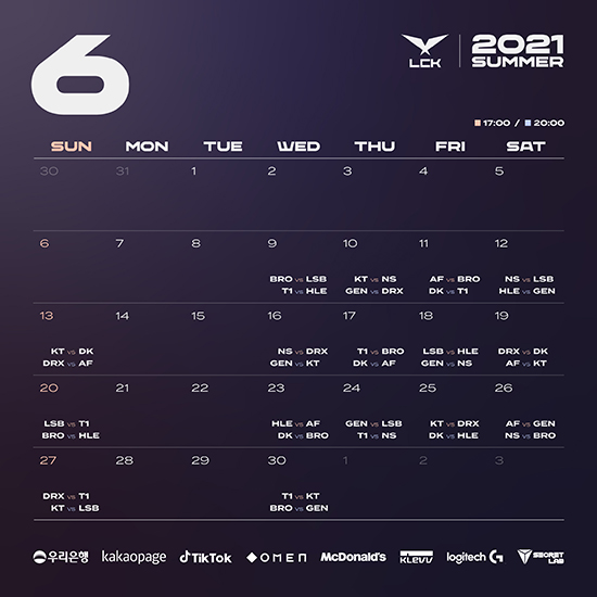 2021 LCK ¼¸Ó °³¸·ÀüÀº 6¿ù 9ÀÏ ¿ÀÈÄ 5½Ã ÇÁ·¹µ÷ ºê¸®¿Â°ú ¸®ºê »÷µå¹Ú½ºÀÇ ´ë°á·Î ¸·À» ¿Ã¸°´Ù. ÀÌÈÄ 2°æ±â¿¡¼ T1°ú ÇÑÈ»ý¸íe½ºÆ÷Ã÷°¡ ¸ÂºÙ´Â´Ù. LCK ¼¸Ó Á¤±Ô ¸®±×´Â °¢ ÆÀ¸¶´Ù 18°æ±â¾¿, ÃÑ 90°æ±â¸¦ 10ÁÖ µ¿¾È ¼ÒÈÇÏ¸ç ¸ðµç °æ±â´Â 3Àü2¼±½ÂÁ¦·Î ÁøÇàµÈ´Ù.