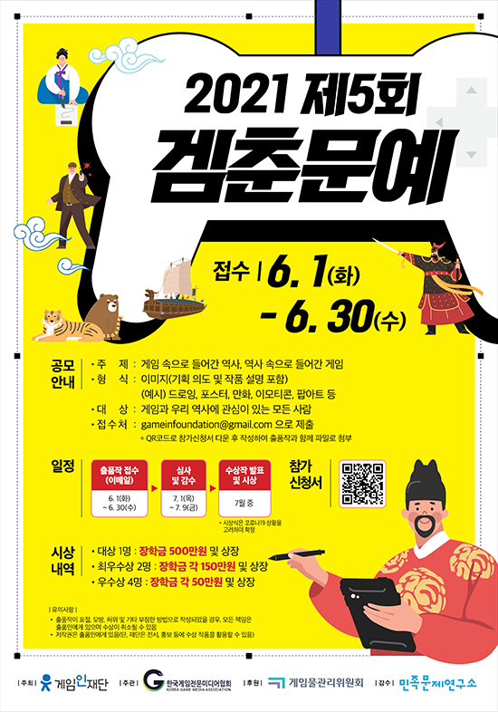 5ȸÂ÷¸¦ ¸ÂÀº ¡®°×Ãá¹®¿¹¡¯´Â ÁÖ¾îÁø ÁÖÁ¦¿¡ ´ëÇØ °ÔÀÓÀεéÀÌ ÀçÄ¡°¡ ³ì¾Æ Àִ âÀÛ¹°À» ¸¸µé¾î Á¦ÃâÇÏ´Â °ø¸ð Çü½ÄÀÇ ´ëȸ·Î, ¿ÃÇØÀÇ ÁÖÁ¦´Â ¡®°ÔÀÓ ¼ÓÀ¸·Î µé¾î°£ ¿ª»ç, ¿ª»ç ¼ÓÀ¸·Î µé¾î°£ °ÔÀÓ¡¯À̸ç Ãâǰ Çü½ÄÀº À̹ÌÁö´Ù. ¿ì¸®³ª¶ó ¶Ç´Â ¿ì¸® ¹ÎÁ·ÀÇ ¿ª»ç Áß¿¡¼ °ÔÀÓ°ú »óÈ£ Åõ¿µÀÌ °¡´ÉÇÑ °ÍÀ̶ó¸é ¹«¾ùÀÌµç ¼ÒÀç·Î »ïÀ» ¼ö ÀÖ°í À̸¦ À̸ðƼÄÜ, ¸¸È, Æ÷½ºÅÍ, µå·ÎÀ×, ÆË¾ÆÆ® µî À̹ÌÁö ÇüÅ·ΠÀÚÀ¯·Ó°Ô ³ªÅ¸³»¸é µÈ´Ù.