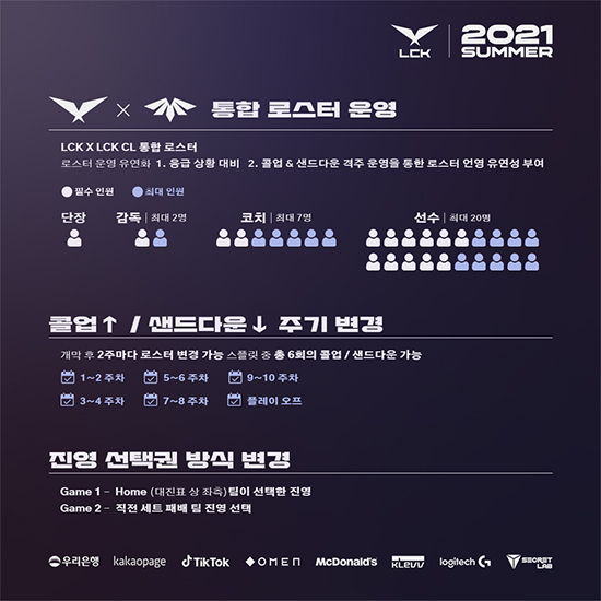 '¸®±× ¿Àºê ·¹Àüµå(LoL)' e½ºÆ÷Ã÷ÀÇ Çѱ¹ ÇÁ·Î ¸®±×¸¦ ÁÖÃÖÇÏ´Â ¸®±× ¿Àºê ·¹Àüµå èÇǾ𽺠ÄÚ¸®¾Æ(ÀÌÇÏ 'LCK')°¡ ¿À´Â 6¿ù 9ÀÏ °³¸·ÇÏ´Â 2021 LCK ¼¸Ó¿¡¼ ÅëÇշνºÅÍ ¿î¿µ, Äݾ÷/»÷µå´Ù¿î Áֱ⠺¯°æ µîÀÇ °³Æí¾ÈÀÌ ´ã±ä ±ÔÁ¤ÁýÀ» °ø°³Çß´Ù.