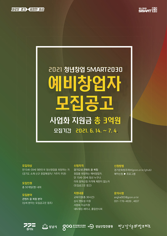 ÆÇ±³ °æ±â¹®È­Ã¢Á¶Çãºê¸¦ ¿î¿µÇÏ´Â °æ±âÄÜÅÙÃ÷ÁøÈï¿ø(°æÄÜÁø)Àº 2021³â ¡®Ã»³ââ¾÷ SMART2030¡¯ Áö¿øÀÚ¸¦ 7¿ù 4ÀϱîÁö ¸ðÁýÇÑ´Ù.