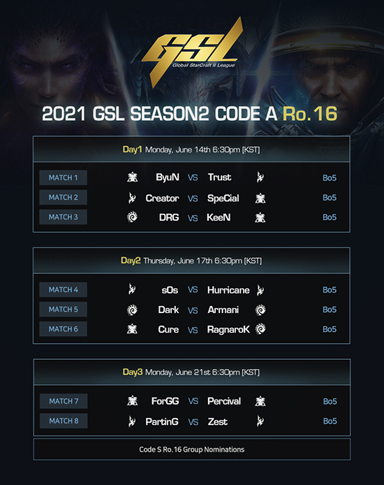 À̹ø ¡®2021 GSL ½ÃÁð2¡¯Àº 6¿ù 14ÀÏ(¿ù)ºÎÅÍ ¾à 7ÁÖ°£ À̾îÁø´Ù. ¸ÕÀú, ÄÚµåS 16°­¿¡ ÁøÃâÇÒ 8¸íÀÇ ¼±¼ö¸¦ ¼±¹ßÇÏ´Â ÄÚµåA°¡ 5Àü 3¼±½ÂÁ¦ ½Ì±Û Åä³Ê¸ÕÆ®·Î 3Àϰ£ ÁøÇàµÈ´Ù. ÄÚµåA¿¡¼­ ¼±¹ßµÈ 8¸íÀÇ ¼±¼ö´Â ¡®2021 GSL ½ÃÁð1¡¯¿¡¼­ ½Ãµå¸¦ ȹµæÇÑ À̺´·Ä(Rogue), Á¶¼ºÁÖ(Maru), Á¶ÁßÇõ(Dream), Á¶¼ºÈ£(Trap) ±×¸®°í ¿¹¼±ÀüÀ» »óÀ§±ÇÀ¸·Î Åë°úÇÑ °­¹Î¼ö(Solar), ÀÌÀç¼±(Bunny), À̽ÅÇü(INnoVation), ¹ÚÇѼÖ(Zoun) µî 8¸íÀÇ ¼±¼ö¿Í ÇÕ·ùÇØ ÄÚµåS 16°­ÀüÀ» Ä¡¸£°Ô µÉ ¿¹Á¤ÀÌ´Ù.