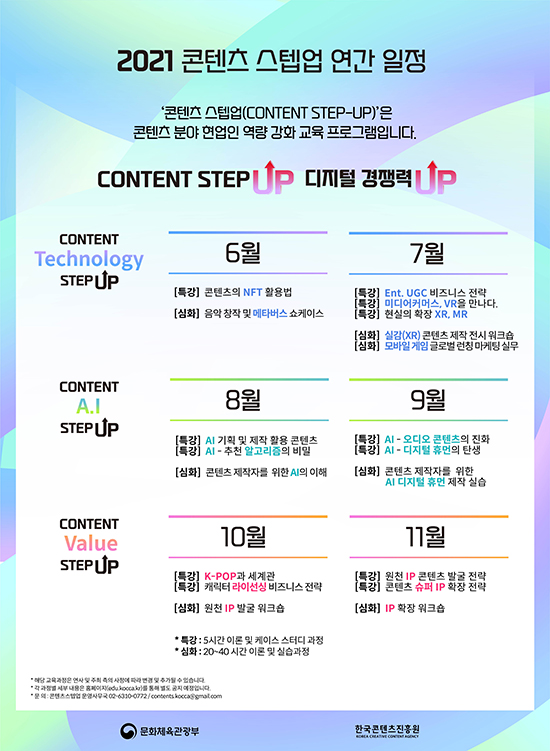 ÄÜÁø¿øÀÇ ÄÜÅÙÃ÷ ½ºÅܾ÷(CONTENT STEP-UP)Àº ÄÜÅÙÃ÷ ºÐ¾ß Á¾»çÀÚ¸¦ ´ë»óÀ¸·Î ÇÏ´Â ±³À° ÇÁ·Î±×·¥À¸·Î Æ÷½ºÆ® Äڷγª ½Ã´ëÀÇ µðÁöÅÐ Àüȯ±â¸¦ ¸ÂÀº ÄÜÅÙÃ÷ ºÐ¾ßÀÇ Á¾»çÀÚ°¡ ȯ°æ º¯È¿¡ ¹ß ºü¸£°Ô ´ëÀÀÇÒ ¼ö ÀÖµµ·Ï Áö¿øÇÒ ¿¹Á¤ÀÌ´Ù.