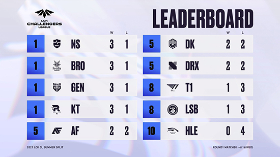 20¸ÅÄ¡±îÁö Ä¡¸¥ LCK CL¿¡¼­´Â »óÀ§±Ç°ú ÁßÀ§±Ç¿¡ Å« Â÷À̰¡ ¾ø´Â »óȲÀÌ´Ù. ³ó½É ·¹µåÆ÷½º, ÇÁ·¹µ÷ ºê¸®¿Â, Á¨Áö e½ºÆ÷Ã÷, kt ·Ñ½ºÅͰ¡ 3½Â 1ÆÐ·Î °øµ¿ 1À§¸¦ ±â·ÏÇϰí ÀÖÀ¸¸ç ±× µÚ¸¦ ¾ÆÇÁ¸®Ä« ÇÁ¸¯½º, DWG KIA, DRX°¡ 2½Â 2ÆÐ·Î °øµ¿ 5À§¿¡ À§Ä¡ÇØÀÖ´Ù.