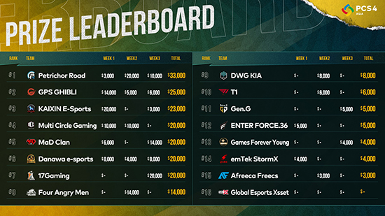 Çѱ¹ÀÌ Æ÷ÇÔµÈ PCS4 ¾Æ½Ã¾ÆÀÇ Ã¨ÇǾ𠿵±¤Àº Áß±¹ÀÇ Petrichor Road¿¡°Ô µ¹¾Æ°¬´Ù. 1ÁÖ Â÷ 8À§·Î ½ÃÀÛÇÑ Áß±¹ÀÇ Petrichor Road´Â 2ÁÖ Â÷ °æ±â¿¡¼ 3ġŲ 83ųÀÇ ¾ÐµµÀû ¼ºÀûÀ» º¸¿©ÁÖ¸ç 1À§¿¡ µî±ØÇß´Ù. À̾î 3ÁÖ Â÷ °æ±â¿¡¼µµ 2ġŲ 48ų·Î 3À§¸¦ ±â·ÏÇϸç, 3ÁÖ°£ ´©Àû »ó±Ý 3¸¸ 3,000´Þ·¯·Î ÃÖÁ¾ ¿ì½ÂÀ» Â÷ÁöÇß´Ù.