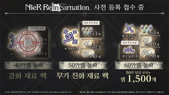 ÁÖ½Äȸ»ç ApplibotÀº SQUARE ENIX°¡ ±âȹ ¹× Á¦ÀÛÇϰí, Applibot ÀÌ °³¹ßÇÑ 'NieR' ½Ã¸®Áî ÃÖ½ÅÀÛ ½º¸¶Æ®Æù Àü¿ë °ÔÀÓ "NieR Re[in]carnation"ÀÌ 2021 ³â 7 ¿ù 29 ÀÏ(KST)ºÎÅÍ ¼ºñ½º¸¦ ½ÃÀÛÇÔÀ» °øÁöÇÏ¿´´Ù.