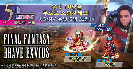 gumi Inc.´Â SQUARE ENIX Ltd.,¿Í °øµ¿ °³¹ßÇϰí Àڻ簡 ¼ºñ½ºÇÏ´Â ¸ð¹ÙÀÏ RPG ¡®FINAL FANTASY BRAVE EXVIUS¡¯°¡ Ãâ½Ã 5ÁÖ³âÀ» ±â³äÇÑ ÇÁ·Î¸ð¼ÇÀ» ÁøÇàÇÑ´Ù°í 2ÀÏ ¹àÇû´Ù.