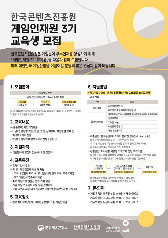 ¹®ÈüÀ°°ü±¤ºÎ¿Í Çѱ¹ÄÜÅÙÃ÷ÁøÈï¿ø(ÄÜÁø¿ø)Àº ´ëÇѹα¹ °ÔÀÓ»ê¾÷ÀÇ ¹Ì·¡¸¦ À̲ø ÀÎÀ縦 ¾ç¼ºÇϱâ À§ÇØ ¡®2021³â °ÔÀÓÀÎÀç¿ø 3±â¡¯ ±³À°»ýÀ» ¿À´Â 22ÀϱîÁö ¸ðÁýÇÑ´Ù.