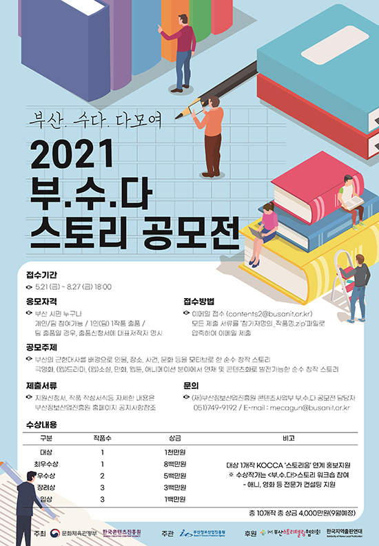 ºÎ»ê±¤¿ª½Ã¿Í ºÎ»êÁ¤º¸»ê¾÷ÁøÈï¿ø(ÁøÈï¿ø)Àº ºÎ»ê¼ÓÀÇ ¼û°ÜÁø À̾߱⠹߱¼À» À§ÇØ ¡®ºÎ»ê. ¼ö´Ù. ´Ù¸ð¿©! ½ºÅ丮 °ø¸ðÀü¡¯(ÀÌÇÏ ºÎ.¼ö.´Ù ½ºÅ丮 °ø¸ðÀü)À» °³ÃÖÇϸç, °ø¸ð ÀÛǰÀ» ¿À´Â 8¿ù 27ÀϱîÁö ¸ðÁýÇÑ´Ù. À̹ø °ø¸ðÀüÀº ºÎ»ê±¤¿ª½Ã¿Í ÁøÈï¿øÀÌ 4¿ùºÎÅÍ ¿î¿µÇϰí ÀÖ´Â ¡®Áö¿ªÆ¯È½ºÅ丮À°¼ºÁö¿ø»ç¾÷¡¯ÀÇ ÀÏȯÀ¸·Î ÁøÇàµÇ¸ç, ¹®ÈüÀ°°ü±¤ºÎ, Çѱ¹ÄÜÅÙÃ÷ÁøÈï¿øÀÌ ÁÖÃÖÇÏ¸ç ºÎ»êÁ¤º¸»ê¾÷ÁøÈï¿øÀÌ ÁÖ°üÇÑ´Ù. °ø¸ð ÁÖÁ¦´Â Á¶¼±¸»ºÎÅÍ Çö´ë±îÁö ¡®¿ª»ç ¼ÓÀÇ ºÎ»ê¡¯À» ¹è°æÀ¸·Î ´Ù¾çÇÑ ¼ÒÀ縦 ´Ù·é ¼ø¼ö âÀÛ ½ºÅ丮À̸ç, ºÎ»ê ½Ã¹Î ´©±¸³ª Âü¿© °¡´ÉÇÏ´Ù.