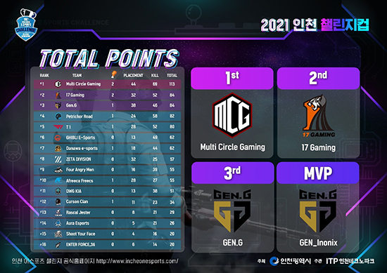 ÀÎõ±¤¿ª½Ã°¡ ÁÖÃÖÇϰí ÀÎõÅ×Å©³ëÆÄÅ©(ÀÌÇÏ ÀÎõTP)°¡ ÁÖ°üÇÏ´Â '2021 ÀÎõ e½ºÆ÷Ã÷ 縰Áö(2021 INCHEON ESPORTS CHALLENGE)¡¯ÀÇ ÇÁ·Î´ëȸ ¡®ÀÎõ 縰Áö ÄÅ(INCHEON CHALLENGE CUP)¡¯¿¡¼ ¡®Multi Circle Gaming(¸ÖƼ ½áŬ °ÔÀ̹Ö)¡¯ÀÌ ÃÖÁ¾ ¿ì½ÂÇß´Ù°í 19ÀÏ ¹àÇû´Ù.