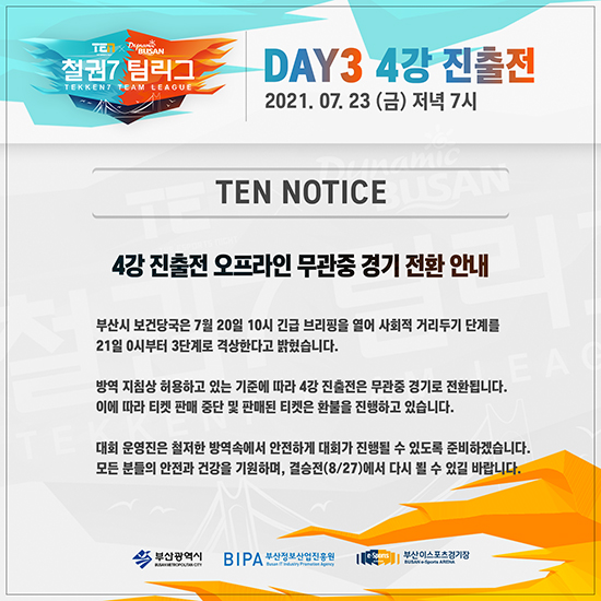 ºÎ»ê½ÃÀÇ »çȸÀû °Å¸®µÎ±â 3´Ü°è °Ý»óÀ¸·Î(21ÀÏ 0½ÃºÎÅÍ) The Esports Night, TEN(ÀÌÇÏ TEN) 2021 ¡®Ã¶±Ç7ÆÀ¸®±×¡¯ 4° ÁøÃâÀüÀÌ ¹«°üÁß °æ±â·Î ÀüȯµÈ´Ù.