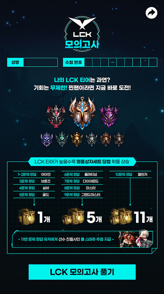 2021 LoL èÇǾ𽺠ÄÚ¸®¾Æ ¼¸Ó(ÀÌÇÏ LCK ¼¸Ó ½ºÇø´) °ø½Ä ÈÄ¿ø»çÀÎ ±Û·Î¹ú ¼ôÆû ¸ð¹ÙÀÏ ºñµð¿À Ç÷§Æû ƽÅåÀÌ LCK ¼¸Ó ½ºÇø´À» ´õ¿í dzºÎÇÏ°Ô Áñ±æ ¼ö ÀÖµµ·Ï µ½±â À§ÇØ 'LCK ¸ðÀǰí»ç' ÄûÁî À̺¥Æ®¸¦ ¿À´Ã ·ÐĪÇÑ´Ù. ÃÖ±Ù »çȸÀû °Å¸®µÎ±â °Ý»óÀ¸·Î LCK ¼¸Ó ½ºÇø´ÀÌ ¹«°üÁß °æ±â·Î ÀüȯµÈ °Í¿¡ ´ëÇØ ¾Æ½¬¿òÀÌ Å« ÆÒµé¿¡°Ô À§¾ÈÀÌ µÉ °ÍÀ¸·Î ±â´ëµÈ´Ù.