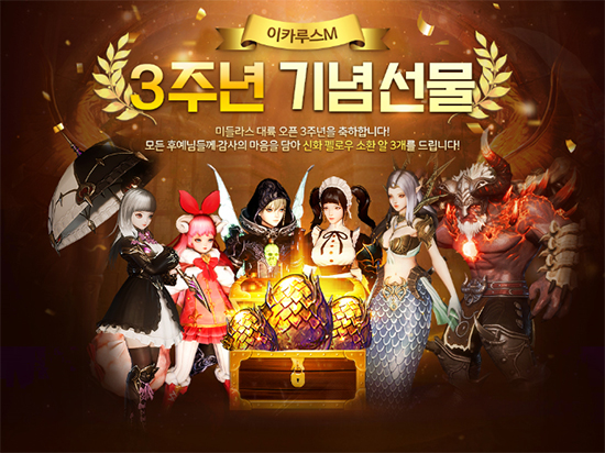 ¹ë·ÎÇÁ¿¡¼ ¼ºñ½º ÁßÀÎ ¸ð¹ÙÀÏ MMORPG 'ÀÌÄ«·ç½ºM'ÀÌ ¼ºñ½º 3ÁÖ³âÀ» ¸Â¾Æ 7¿ù 28ÀϺÎÅÍ 3Áֳ⠱â³ä °¨»ç À̺¥Æ®¸¦ ½Ç½ÃÇÑ´Ù°í ¹àÇû´Ù.