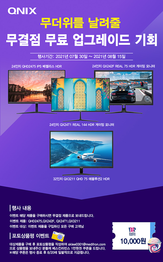 Å¥´Ð½º±×·ì(www.qnixgroup.co.kr)Àº, ¹«´õÀ§¿¡ ¸Â¼ 7¿ù 30ÀÏ ~ 8¿ù 15ÀÏ µ¿¾È Å¥´Ð½º Á¦Ç°±º Áß Å¥´Ð½º QHD2475 IPS º£Á©¸®½º HDR, QX3211 QHD 75 ¿¡ºí·ç¼Ç2 HDR, QX242F REAL 75 HDR, QX24T1 REAL 144 HDR ¸ðµ¨À» ´ë»óÀ¸·Î À̺¥Æ®¸¦ ÁøÇàÇÑ´Ù.