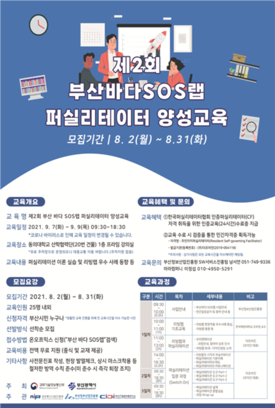 À̹ø ±³À°Àº ¿À´Â 9¿ù 7ÀÏ(È)ºÎÅÍ 9¿ù 9ÀÏ(¸ñ)±îÁö 3Àϰ£ ÁøÇàµÈ´Ù. 25¸í ³»¿Ü ¸ðÁýÀ̸ç, ºÎ»ê ½Ã¹Î ´©±¸³ª Âü¿© °¡´ÉÇÏ´Ù. ÆÛ½Ç¸®Å×ÀÌÅÍ ¾ç¼ºÀ» ÅëÇØ Çõ½Å ½Ã¹ÎÀ» ¾ç¼ºÇÏ°í ºÎ»ê ¹Ù´Ù SOS·¦ÀÇ ½Ã¹Î ¿¬±¸¹Ý ¿ª·®À» °ÈÇÏ¿©, Áö¿ª»çȸÀÇ ½Ã¹Î Ä¿¹Â´ÏƼ ±â´ÉÀ» °ÈÇϰíÀÚ ¸¶·ÃµÆ´Ù. Áö³ÇØ ¡®ºÎ»ê ¹Ù´Ù SOS·¦¡¯À» ÅëÇØ ÃÑ 44¸íÀÇ ÆÛ½Ç¸®Å×ÀÌÅͰ¡ ¾ç¼ºµÆÀ¸¸ç, ¿ÃÇØ¿¡´Â ¼¼Â÷·Ê·Î ³ª´² ÃÑ 60¸íÀÌ ¾ç¼ºµÉ °èȹÀÌ´Ù. ¼ö·á»ý Áß Èñ¸ÁÀÚ¿¡ ÇÑÇØ ºÎ»ê ¹Ù´Ù SOS·¦ ½Ã¹Î¿¬±¸¹ÝÀÇ º¸Á¶ ÆÛ½Ç¸®Å×ÀÌÅÍ·Î Âü¿©ÇÏ´Â ±âȸ¸¦ Á¦°øÇÑ´Ù.