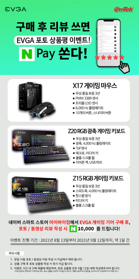 ÀÌ¿¥ÅؾÆÀÌ¿£¾¾´Â ÀÌ¿¥ÅؾÆÀÌ¿£¾¾ °ø½Ä ³×À̹ö ½º¸¶Æ® ½ºÅä¾î ¾ÆÀ̹ÙÀÌÄÄ¿¡¼ EVGA X17 °ÔÀÌ¹Ö ¸¶¿ì½º¿Í Z20 RGB ±¤Ãà °ÔÀÌ¹Ö Å°º¸µå, Z15 RGB °ÔÀÌ¹Ö Å°º¸µå¸¦ ±¸ÀÔ ÈÄ, Æ÷Åä »óǰÆò ÀÛ¼º ½Ã ³×À̹ö ÆäÀÌ Æ÷ÀÎÆ® 1¸¸ ¿øÀ» Áö±ÞÇÏ´Â À̺¥Æ®¸¦ ÁøÇàÇÑ´Ù°í ¹àÇû´Ù.