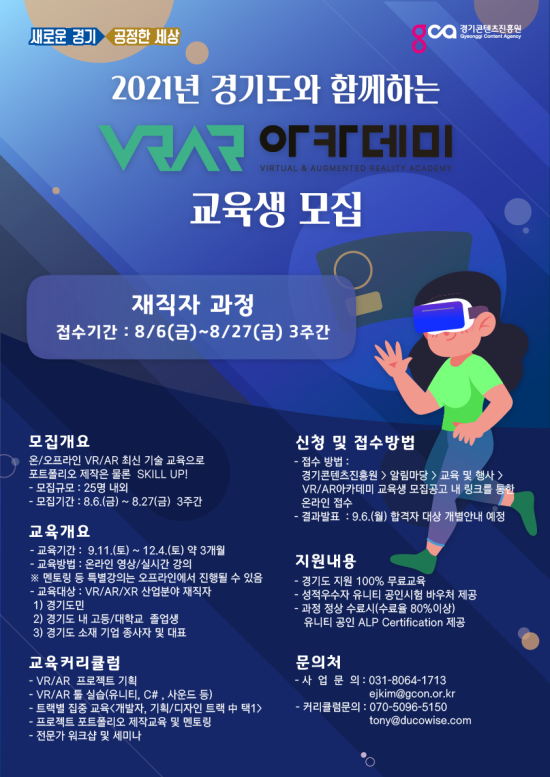 °æ±âµµ´Â °¡»ó/Áõ°Çö½ÇÀ» Æ÷ÇÔÇÑ È®ÀåÇö½Ç ½Ç°¨±â¼ú(VR/AR/XR) Àü¹®Àη ¾ç¼ºÀ» À§ÇÑ ¡®2021³â VR/AR ¾ÆÄ«µ¥¹Ì¡¯ ÀçÁ÷ÀÚ°úÁ¤ ±³À°»ýÀ» ¿À´Â 27ÀϱîÁö ¸ðÁýÇÑ´Ù.