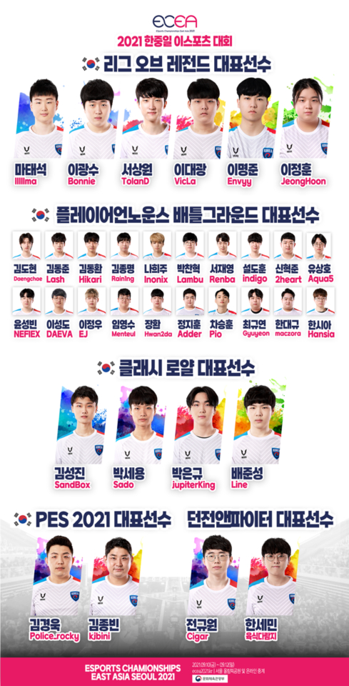ÇÑÁßÀÏ À̽ºÆ÷Ã÷ ´ëȸ Á¶Á÷À§¿øÈ¸´Â 8¿ù 31ÀÏ ¡®2021 ÇÑÁßÀÏ À̽ºÆ÷Ã÷ ´ëȸ(Esports Championships East Asia 2021)¡¯¿¡ Âü°¡ÇÒ ´ëÇѹα¹ ´ëÇ¥ ¼±¼ö ¸í´ÜÀ» ¹ßÇ¥Çß´Ù.
