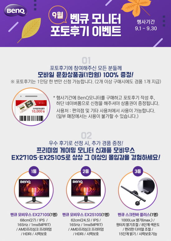À̹ø Æ÷ÅäÈıâ´Â 9¿ù ÇÑ ´Þ °£ º¥Å¥ ¸ð´ÏÅ͸¦ ±¸ÀÔÇÏ°í »çÁøÀ» Æ÷ÇÔÇÑ ±¸¸ÅÈı⸦ ÀÛ¼ºÇÑ ¸ðµç ¼ÒºñÀڵ鿡°Ô ¸ð¹ÙÀÏ ¹®È»óǰ±Ç(1¸¸¿ø±Ç)À» ÁõÁ¤Çϰí, ¿ì¼ö Èıâ·Î ¼±Á¤µÈ 3¸í¿¡°Ô´Â º¥Å¥ ÇÁ¸®¹Ì¾ö °ÔÀÌ¹Ö ¸ð´ÏÅÍ ¸ðºñ¿ì½º EX2710S, EX2510S¿Í ´«ÀÌ ÆíÇÑ ¸ð´ÏÅÍ Á¶¸í ¡®º¥Å¥ ½ºÅ©¸°¹Ù Ç÷¯½º ¾ÆÀÌÄɾî e¸®µù ·¥ÇÁ¡¯¸¦ Ãß°¡·Î ÁõÁ¤ÇÏ´Â Çà»ç´Ù.